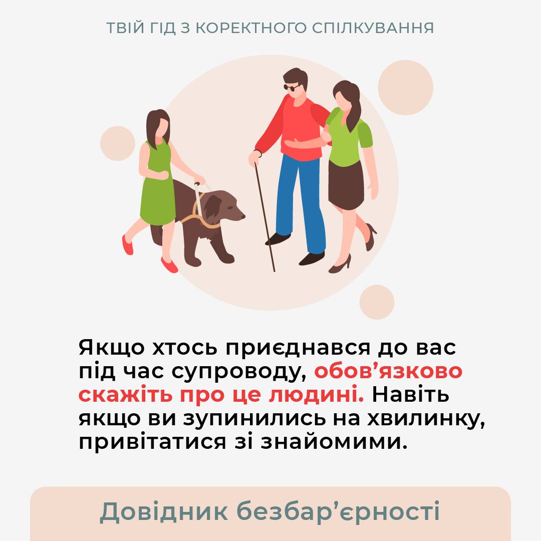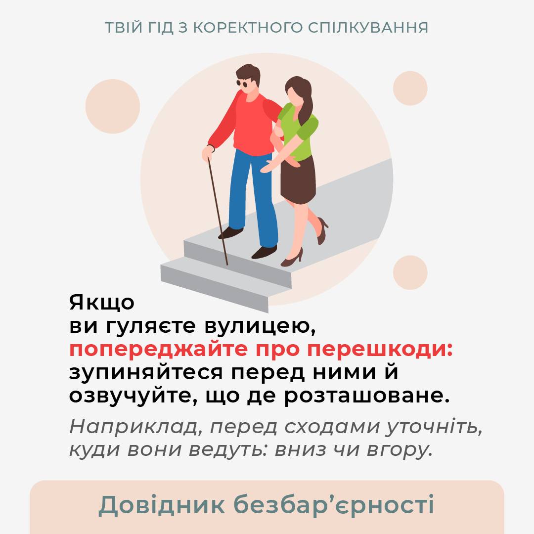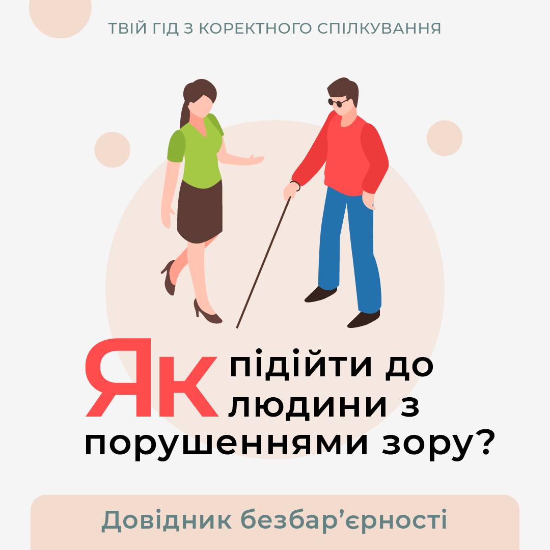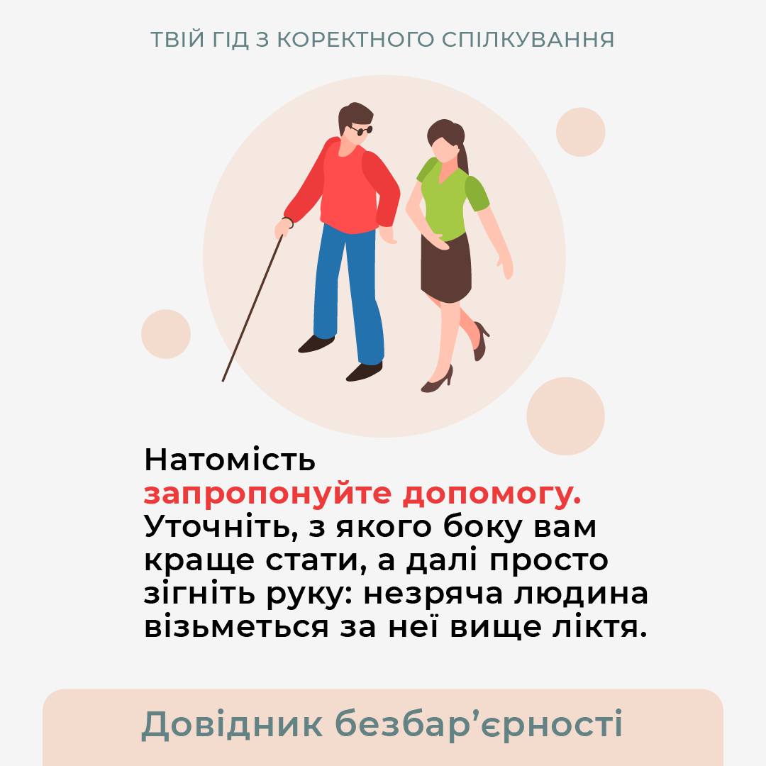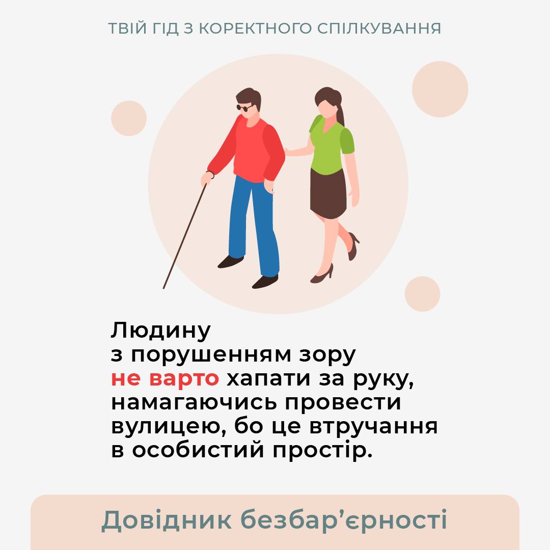 Не лише які слова добирати, щоб не образити гідність людини, але й як взаємодіяти з нею – про це окремий розділ «Довідника безбар’єрності» – «Етика коректної взаємодії» (https://bf.in.ua/ethics/). Щоб якомога більше людей цієї етики дотримувалися, розпочну серію публікацій, спираючись на поради довідника. І сьогодні про те, як взаємодіяти з людиною із порушенням зору: підійти, провести по вулиці, оминути разом перешкоди.